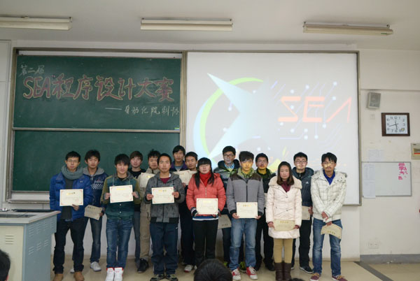 2012年12月19日,由太阳集团tyc33455官网科协主办的第二届“SEA杯”程序设计大赛圆满落幕。自动化院科协前研发部副主任王福、前研发部成员王献东、现任副主席刘赟、赵孔明和研发部主任石剑桥等人担任本次活动评委。