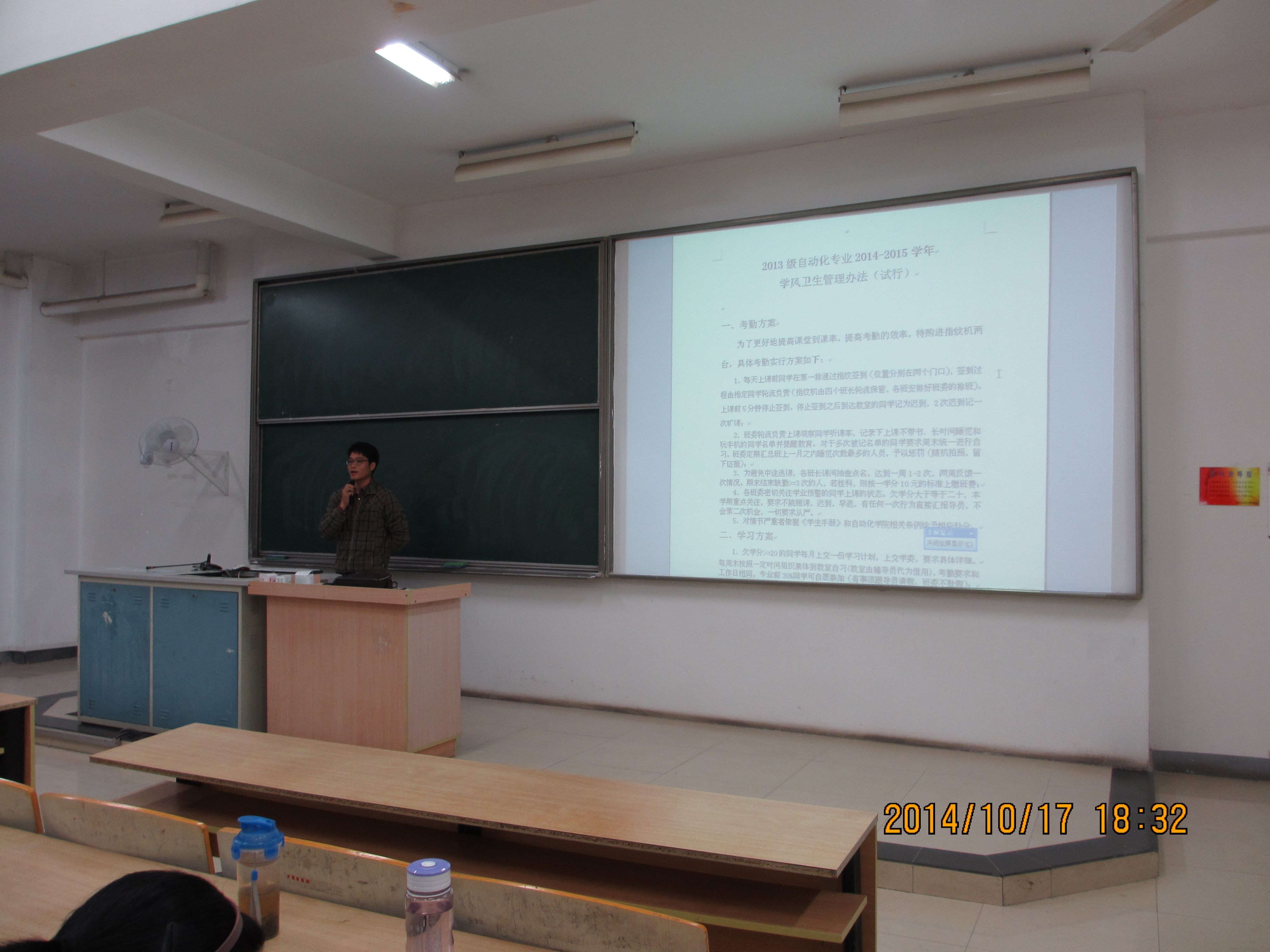 最后,秦老师公示了他和各班委精心策划的学风卫生管理办法。一个班级学风如何直接决定了这个班级成绩如何,素质如何,而整风的侧重点在大一学年欠学分较多的同学,针对他们一学年的表现,秦老师出台了包括指纹签到,周末集体自习,公司处分等等一系列的管理办法,以期对他们起到约束和督促的作用。而对于卫生方面,秦老师继续延续大一学年的严管理方案,将我们生活的宿舍变为干净,整洁,温馨的家。