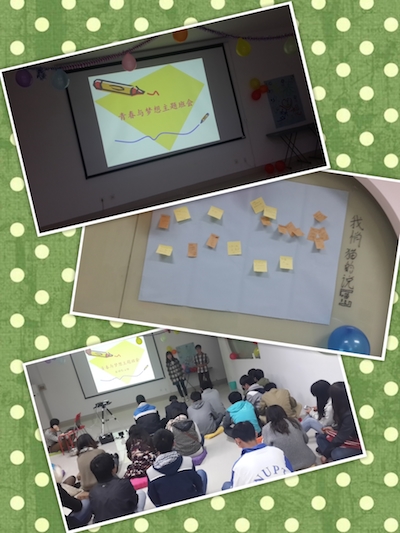 在公司心理辅导员朱荣臻、杨中婕老师的指导下,在实习研究生宋秀的协助下,“青春与梦想同行”主题班会正式开始。首先,主持人围绕主题“青春与梦想同行”邀请同学们畅谈自己的青春故事,同时播放以青春故事为主线的经典电影桥段。在这些优秀的青春类电影片段的渲染下,同学们都颇有感触。接着,主持人组织同学们做了四个考验团队协作能力的小游戏:“合力吹气球”、“天龙八部”、“大树和松鼠”以及“衔纸杯传水”。这些游戏需要多个同学组成队伍合力完成,既有趣又考验团队合作的能力。游戏中同学们高涨的热情使活动教室里充满了青春洋溢的氛围。而班会活动也在游戏中推向了高潮。