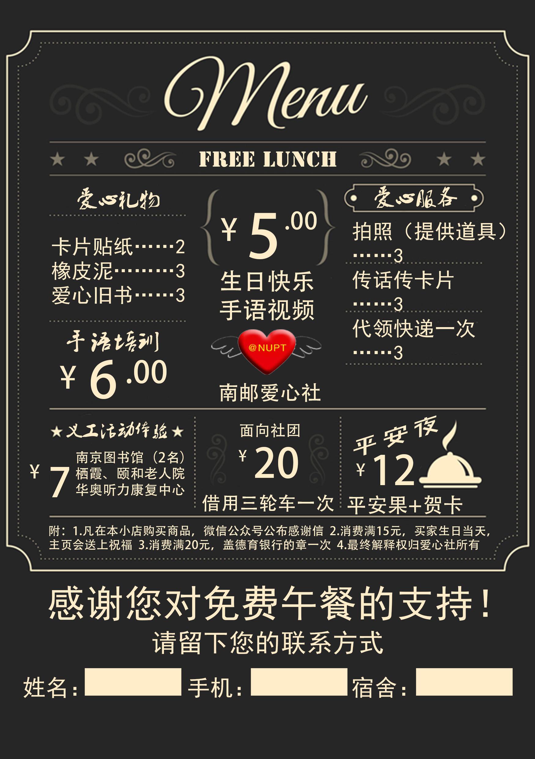 本次活动爱心社将已有的社团特色与免费午餐活动相结合,以手语快闪的形式吸引全校师生的关注,进一步扩大活动的公益影响力。并推出以志愿服务为主题的特色菜单,将义工体验的机会提供给全校同学。