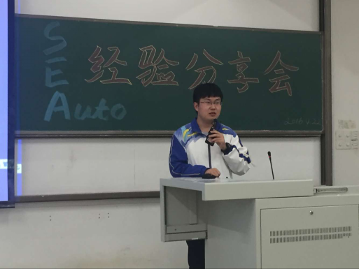 首先上台演讲的是肖路,作为一名曾经在自动化院科协学习并奋斗过的科协人,肖路主要从时间管理、对研究的态度、对比赛的认知、对自己的感悟等四方面入手向大家分享。他提到时间管理是共性的问题,需要很大的毅力去控制自己;通过结合自身的经历以及经验,告诫学弟学妹们在日常的学习和生活中,要尽量地多尝试,多积累并为以后就业等方面打下坚实的基础。在对自己四年生活的总结中提到要大胆,对自己感兴趣的事情就要投入精力,不要让自己后悔。