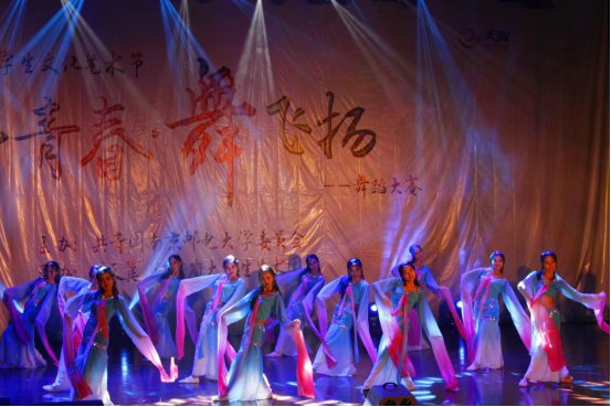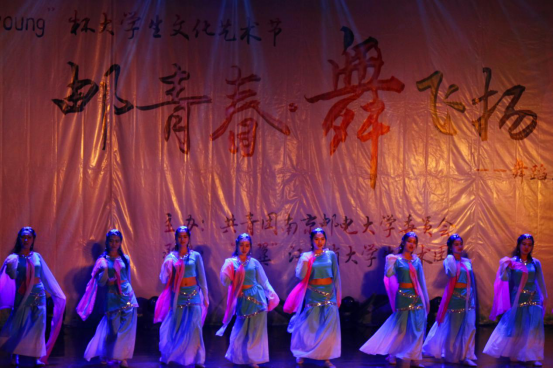 公司的舞蹈队第三个登场,这支舞蹈队由公司大一、大二的女生们组成。伴随着曲调婉转的《采薇》,公司女生身着淡蓝色纱质舞衣,袖若流水清泓,裙若荧光飞舞,纤腰灵动,回眸浅笑,倾身起舞,舞姿婀娜,犹如月下仙子,赢得全场热烈掌声,也得到了评委老师的高度认可。