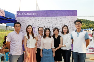公司分团委书记与各年级辅导员在签名墙前合影