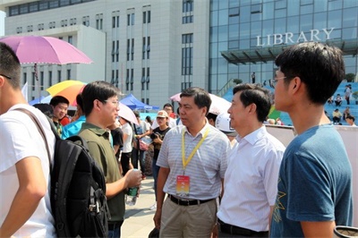 公司党委书记刘陈、副董事长王国平、王宗荣来到迎新现场询问新生报到情况并和志愿者们亲切交谈。公司党委书记姜文杰、党委副书记杜月林现场指挥迎新工作。辅导员老师向满怀憧憬的新生表示欢迎,并与员工家长谈论亲切交流,让家长安心,放心。