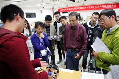 大会第一项,主持人宣布宣讲会开始,介绍到场嘉宾。此次出席的嘉宾阵容强大,充分体现了公司对此次大会的重视程度。大会第二项,由高翔经理和杜月林书记进行讲话。两位院领导深度总结了公司过去取得的骄人成绩,同时给出现阶段的科技发展任务,包括Robcup机器人大赛、飞思卡尔竞赛及老员工电子设计大赛等。至此,宣讲会结束,创新杯院赛开始。评委依次浏览各个作品,参赛者进行三分钟讲解,之后评委团针对各参赛队伍的实际作品情况给出点评与指导性建议。作品展示过程中引得众人围观,气氛有着科技的严谨而又不失轻松。
