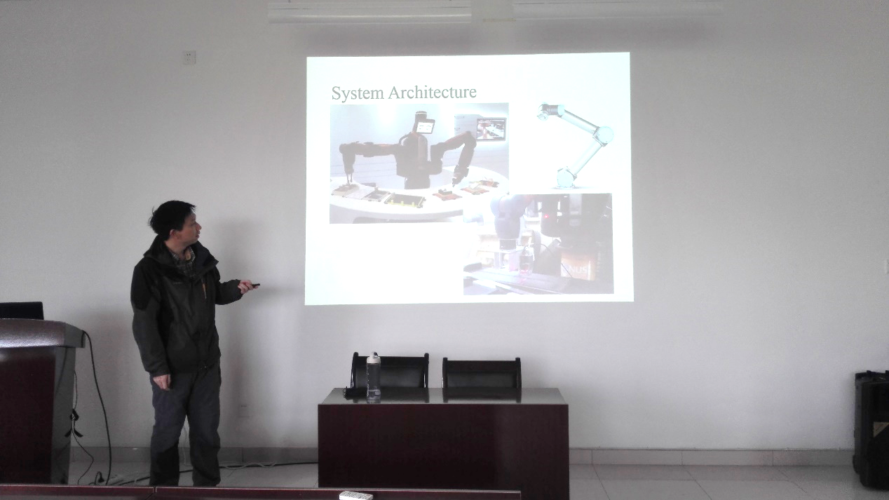 朱老师在报告中介绍了赴新加坡从事项目的主要情况。首先介绍了焊接机器人应用背景,进而引出面向研究的焊接机器人实验平台主要需要解决的问题和研究意义。随后讲解了系统构成和软件系统的具体实现细节,包括:机器人硬件平台选型,系统功能模块设计及实现,系统整合时遇到的问题及解决方法等方面。朱老师运用理论知识解决实际工程问题的方法和思路在与会师生中引起强烈反响。