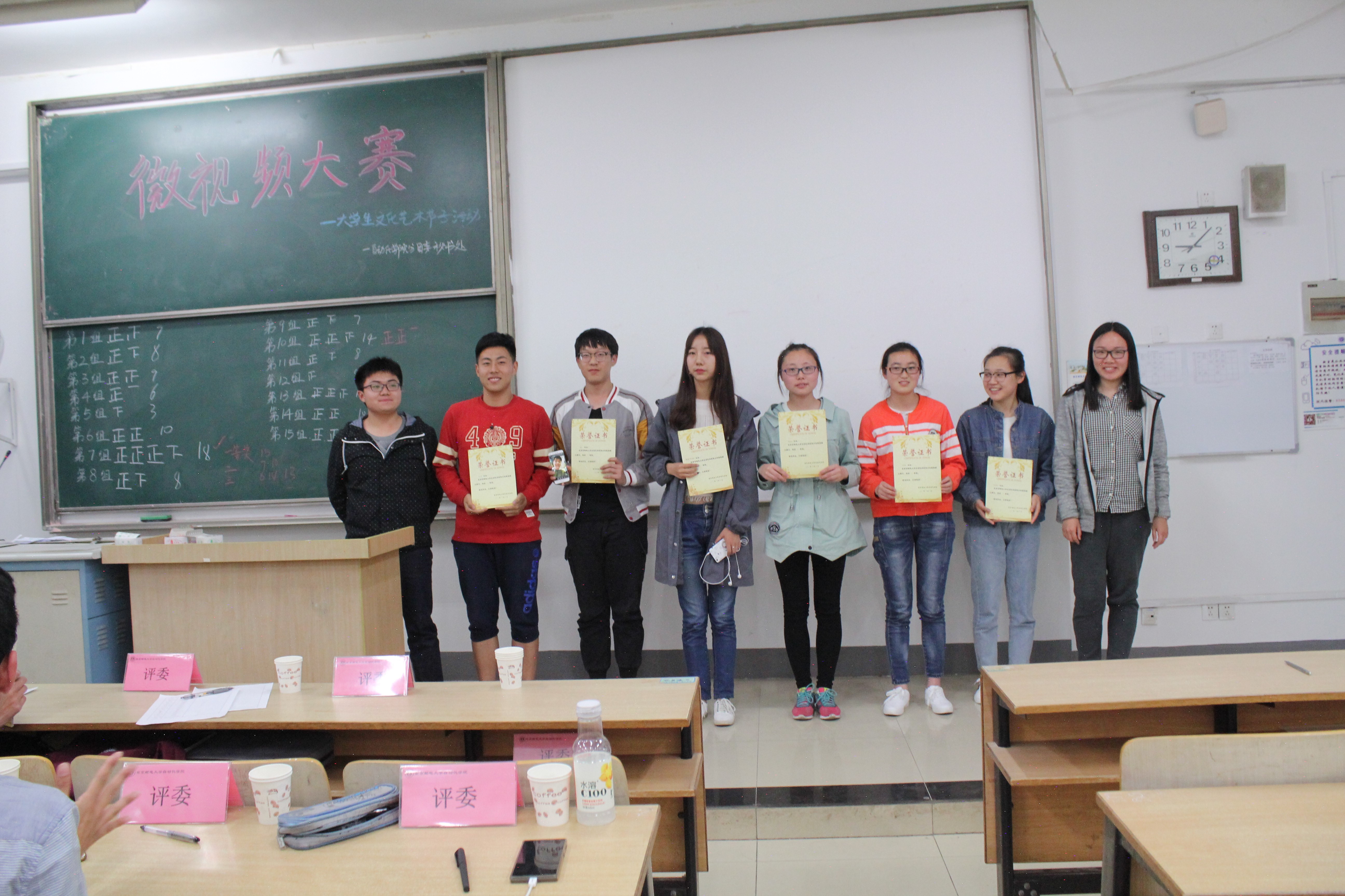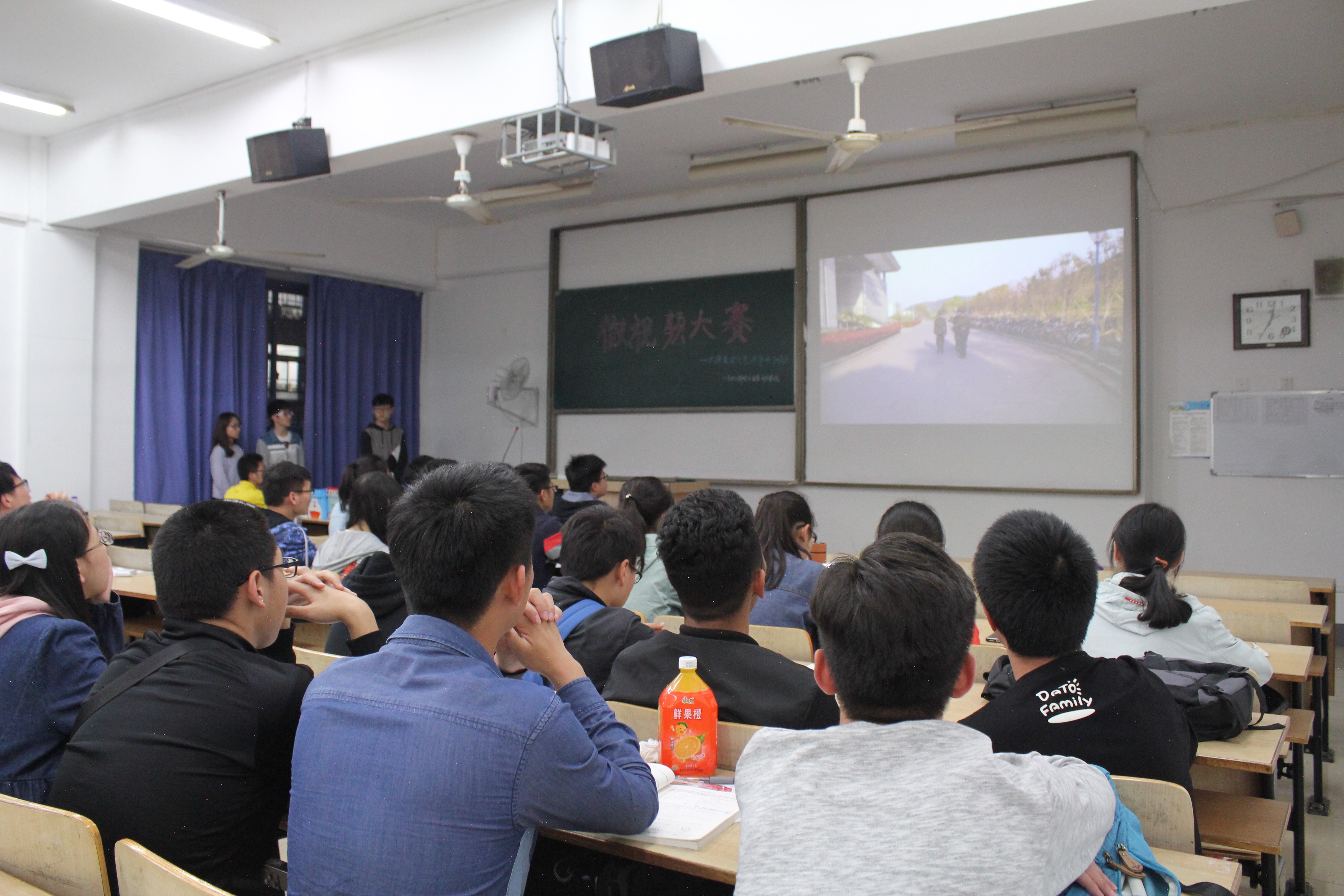此次大赛主要分为“超级英雄”和“回眸经典”两个主题,在简短的比赛规则介绍后,每个小组按照之前抽签的顺序依次上台展示。对于同一个主题,参赛小组的表现方式也及其多样化。对于“超级英雄”,有小组以当下极富话题性的校园暴力作为切入点,引人深思,也有小组通过记录那些在我们身边默默无闻付出的勤劳工作者来诠释这一主题;而至于“回眸经典”,各小组或对某一片段进行翻拍,或进行适当的改编来贴近生活,或一段小小的创意剪辑来表达敬意。在微视频的观赏过程中,同学们的感情也随着各剧情的走向而沉浮。最后,经过激烈的投票环节,以B150508班翻拍的《同桌的你》为代表的六部作品获得了奖项。