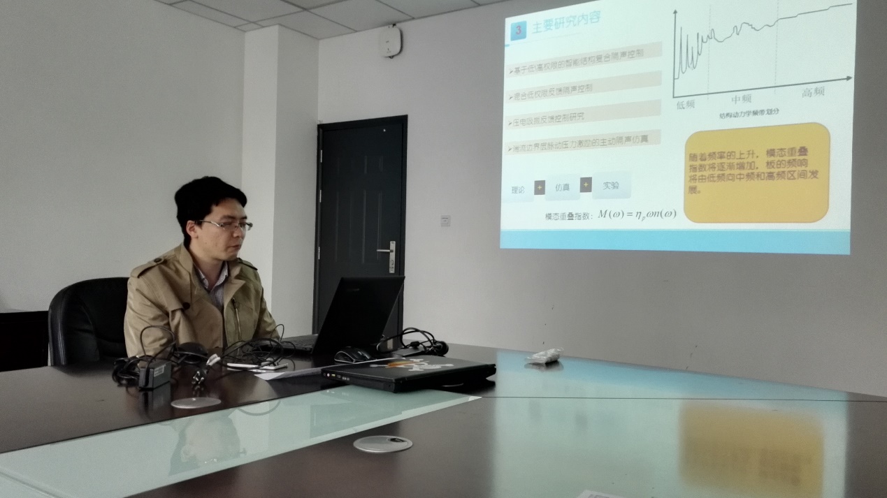 袁老师详细介绍了主动隔声的应用背景和基本实现方法,从理论、数值计算和实时控制算法三个方面给出了如何利用压电器件等智能材料实现结构主动隔声的各项要素,并给出了在加筋壁板等实际工程结构上的测试结果。报告结束后,与会师生围绕智能材料的主动隔声中各种控制算法算法优劣进行了深入的讨论和互动。