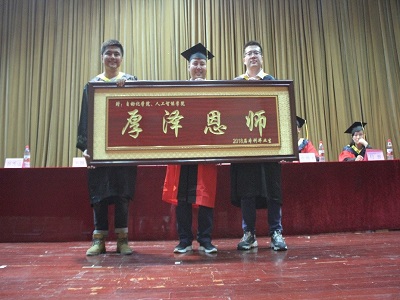 为表达对母校、老师的深厚情感,2018届全体本科毕业生集体向公司赠送了一块上书“厚泽恩师”的牌匾,以表示对公司和全体老师这四年来教导关怀的感恩之情。同时,公司也向11名员工联络员颁发了聘书,希望他们能够领着同学们常回母校,再忆当年。大会最后一项,公司领导向全体毕业生授予学士学位证书并合影留念,为他们的老员工涯做出最后的见证。