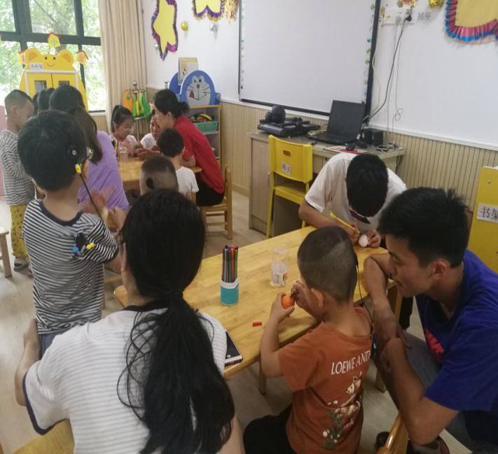 志愿者们到达华澳后的第一项工作是帮助小朋友们穿衣服,整理床褥。牵着软乎乎的小手,看着小小的床位和五颜六色的被单,志愿者们似乎回到自己的孩提时代。到了上课时间,可爱的志愿者小姐姐、小哥哥们教小朋友们认识颜色和彩蛋,并且协助小朋友们使用彩笔给彩蛋上色。教学的过程并非一帆风顺,小朋友们因特殊的身体状况不能完全跟上课堂进度,但志愿者非常耐心的重复着教学内容,引导小朋友们记忆,鼓励他们积极举手回答问题。最后,在志愿者的帮助下小朋友们完成了彩蛋的上色。欢快的时间总是飞速即逝,课堂中的欢声笑语以及孩子们笑靥如花的脸庞将会永远留在志愿者们的心中。