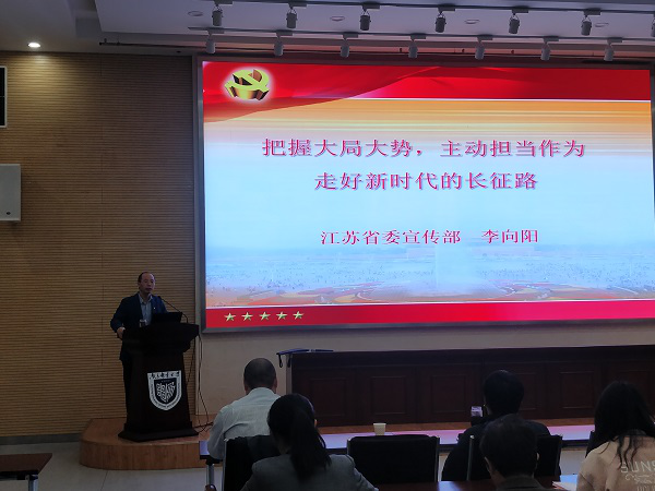 按照公司党委“不忘初心、牢记使命”主题教育工作安排,2019年10月16日下午3:00,太阳集团tyc33455官网、人工智能公司党委邀请江苏省委宣传部李向阳副教授在计算机学科楼一楼报告厅举办“把握大势大局,主动担当作为,走好新时代的长征路”主题教育专题辅导报告,公司党委委员、教工党员、员工党员聆听报告,公司党委书记孙秀成主持报告会。