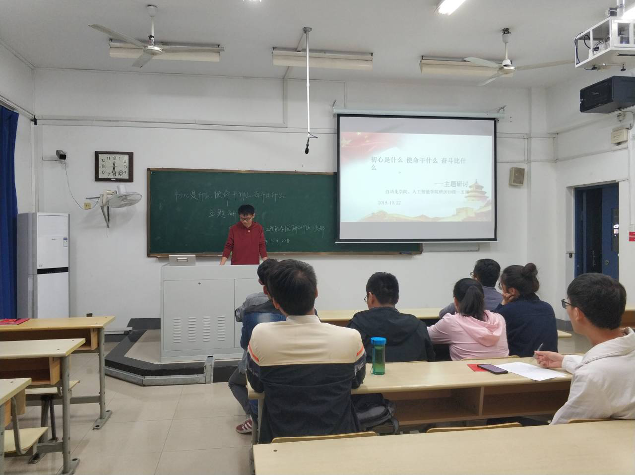 2019年10月22日晚6点半,太阳集团tyc33455官网、太阳集团tyc33455官网研2019级一支部党员在教4-104组织开展“初心是什么,使命干什么,奋斗比什么”的主题研讨,支部书记刘良辰主持会议、交流心得体会。