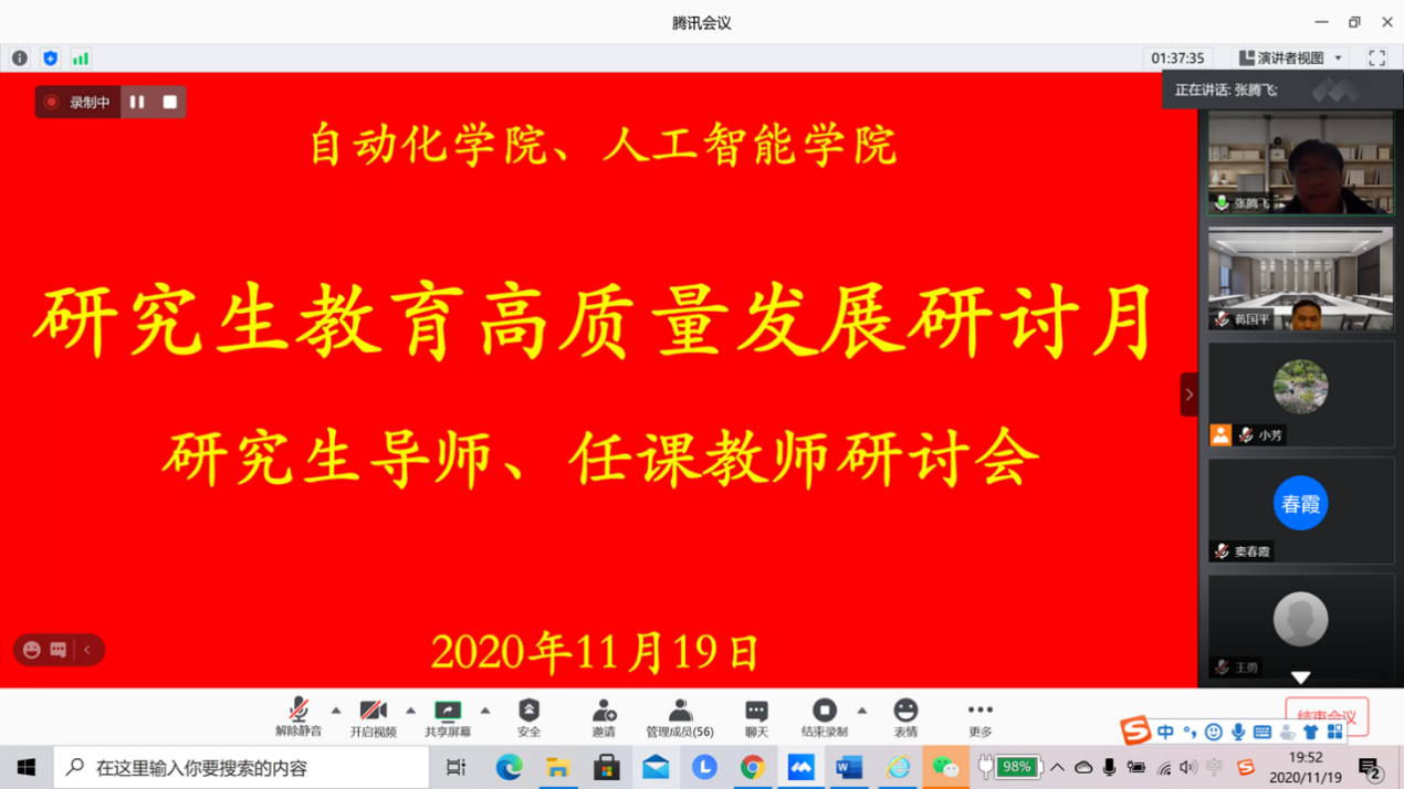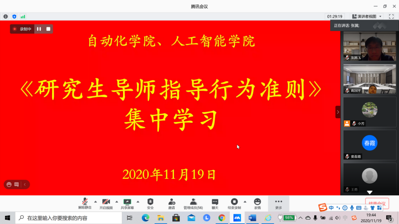 2020年11月19日,公司通过腾讯会议组织全体研究生导师集中学习《研究生导师指导行为准则》,并组织召开研究生导师、任课教师研讨会。蒋国平副董事长、公司张翼书记出席会议,公司研究生导师和任课教师参会。