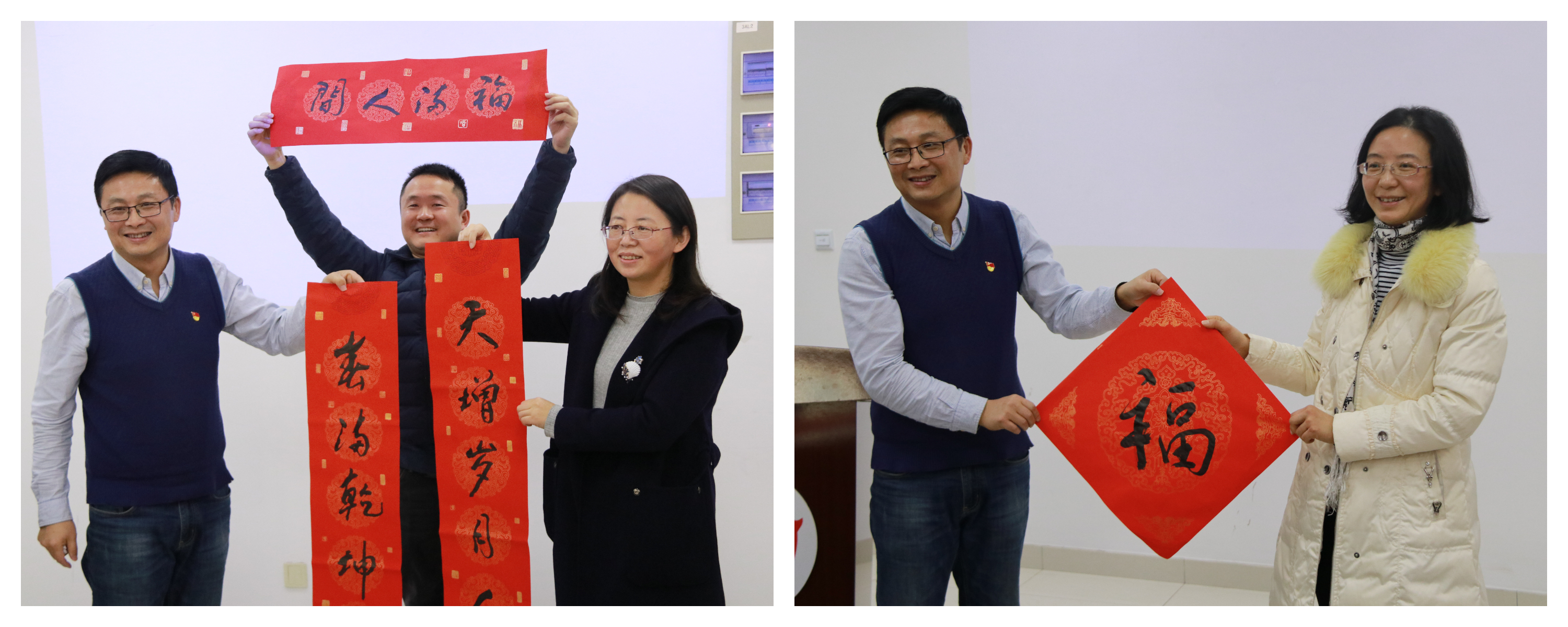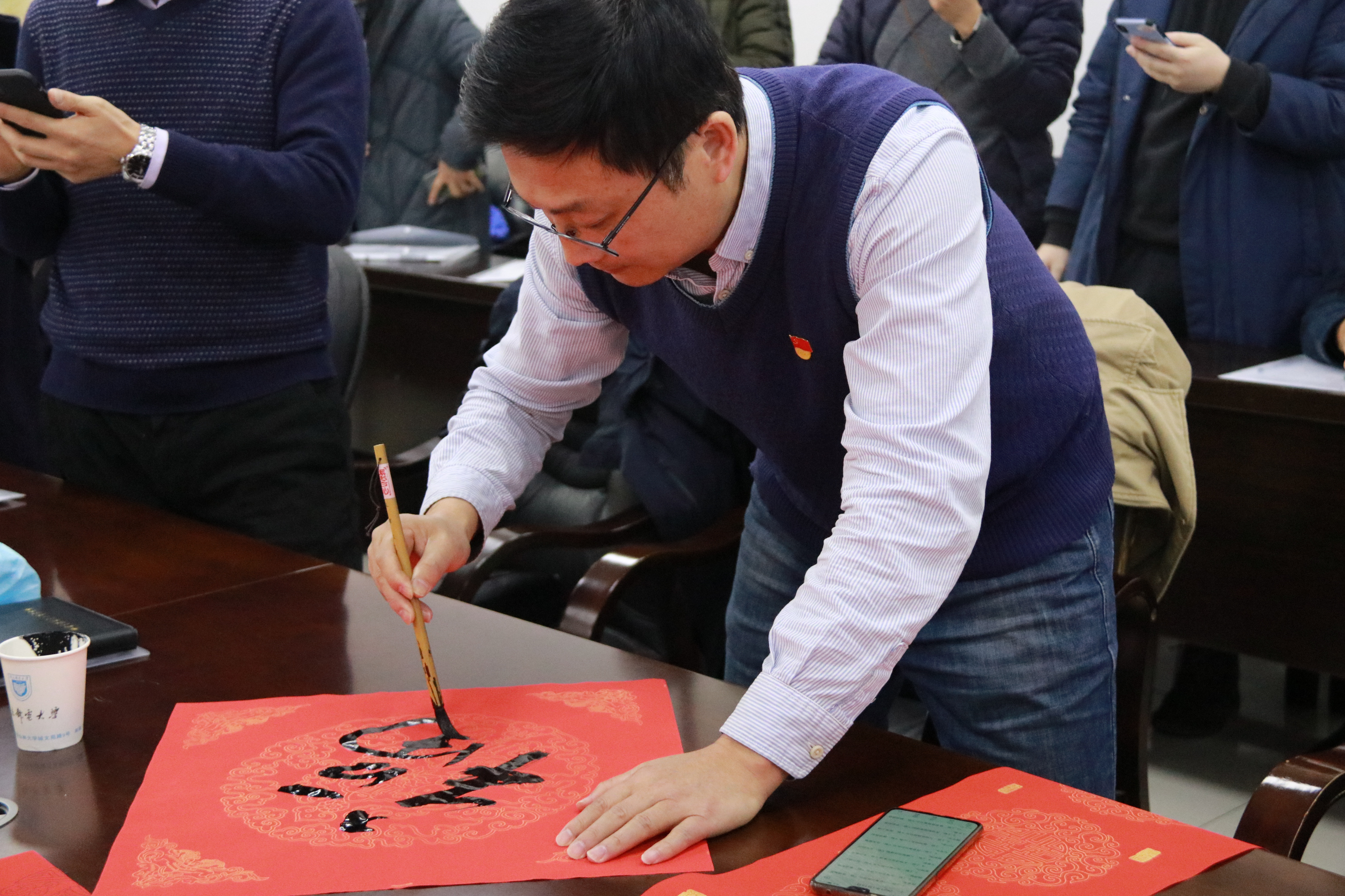 恰逢公司召开第二届教职工代表大会暨工会会员代表大会第三次会议,公司党委书记张翼现场挥毫,为教职工书写春联、福字,苍劲老道的行草映衬在洒金红宣纸上显得赏心悦目。本次活动所有春联、福字,均由陈迪生副书记代表工会,分发给公司教职工。