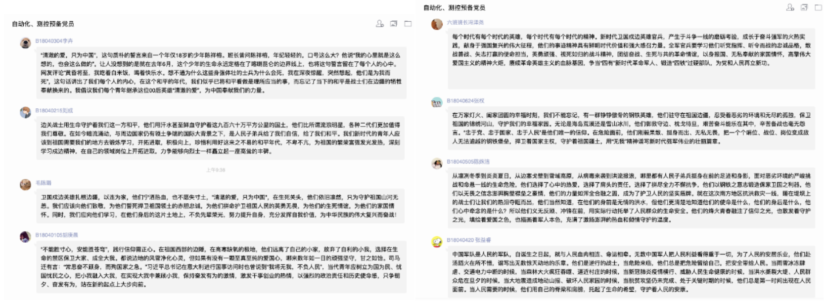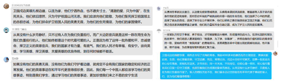 “清澈的爱,只为中国。”在祖国的边疆,英雄官兵用铮铮誓言和实际行动诠释着对祖国最纯洁的爱。家为人民不怕牺牲、勇于奉献的精神,学习他们的责任与担当,把个人与祖国相联系,把个人梦想融入国家的复兴之梦。2020级各支部,积极组织广大团员学习观看戍边英雄事迹,谈体会、写感悟,在线上平台积极展开讨论交流。“祖国的边疆有一群可爱的人在时刻用生命保护我们,作为当代老员工,我要学好知识、努力奋斗,致敬中国这些边防战士,他们是最可爱的人。”B200408班夏雨轩说。