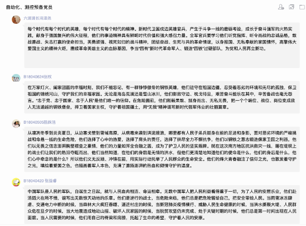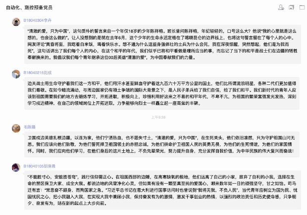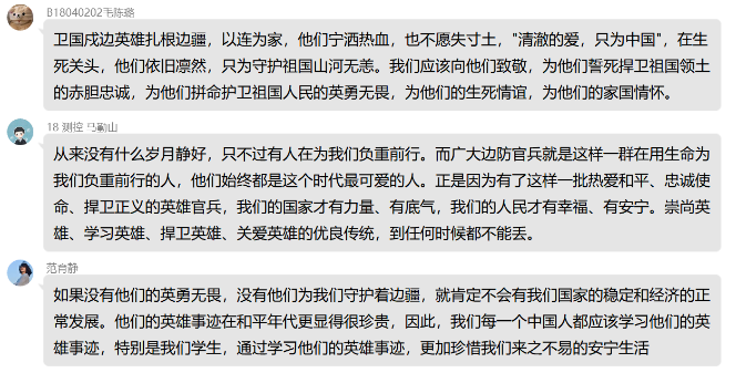 “清澈的爱,只为中国。”在祖国的边疆,英雄官兵用铮铮誓言和实际行动诠释着对祖国最纯洁的爱。家为人民不怕牺牲、勇于奉献的精神,学习他们的责任与担当,把个人与祖国相联系,把个人梦想融入国家的复兴之梦。2020级各支部,积极组织广大团员学习观看戍边英雄事迹,谈体会、写感悟,在线上平台积极展开讨论交流。“祖国的边疆有一群可爱的人在时刻用生命保护我们,作为当代老员工,我要学好知识、努力奋斗,致敬中国这些边防战士,他们是最可爱的人。”B200408班夏雨轩说。