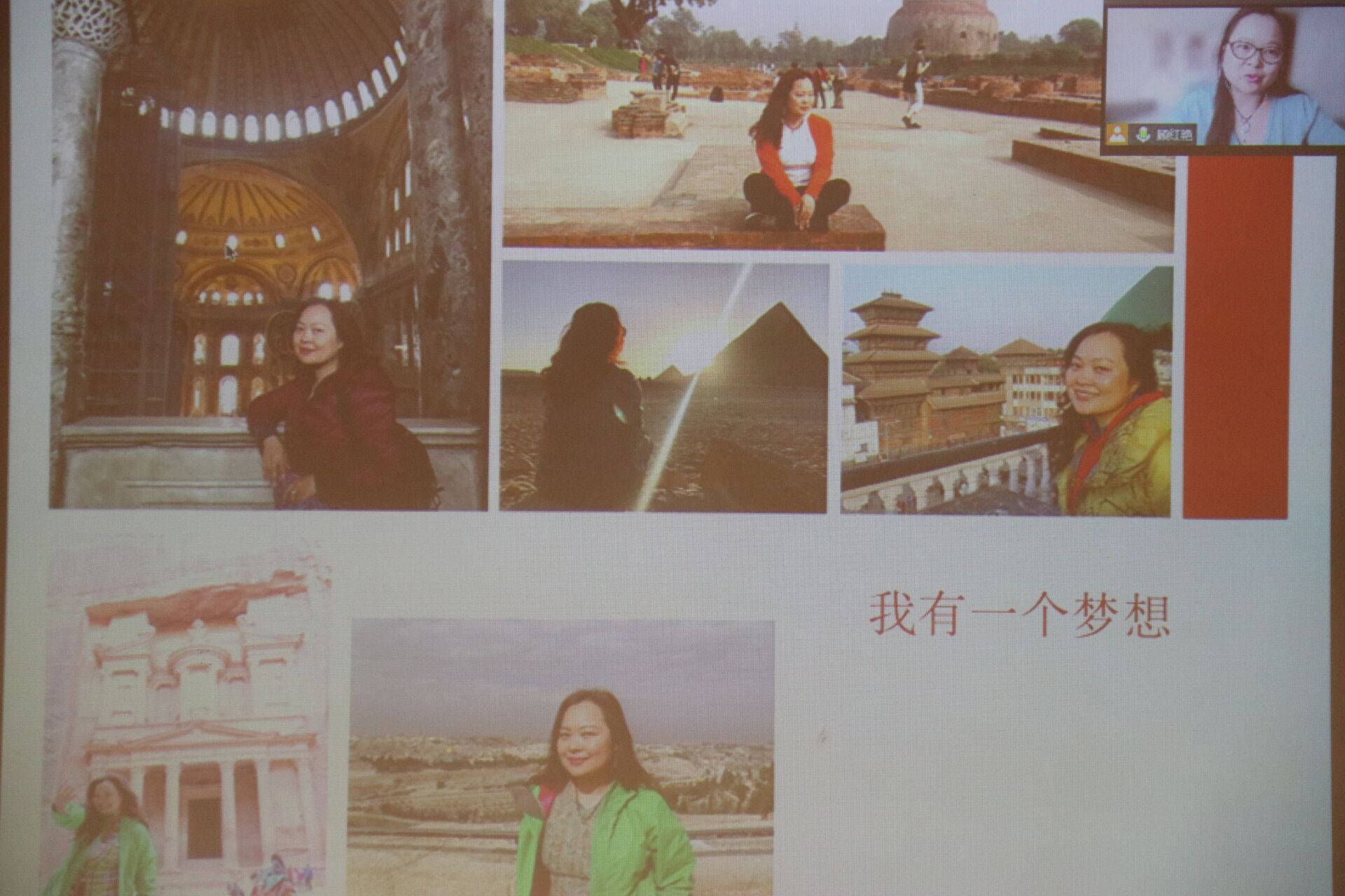 “顾学姐”通过连线潘老师以线上交流会的方式跨越了中英两国的距离与时差,讲述了自己不断跨界跳槽,最终找到心中理想的别样经历后,又分享了现在繁忙充实而又充满意义的美好老员工活,同时,介绍了曾经打卡世界各地的文化遗址的照片。我们深切地感受到了顾红艳“学姐”时刻充满正能量的积极生活态度,潘老师也打趣说,“顾学姐”是他们的“开心豆”。