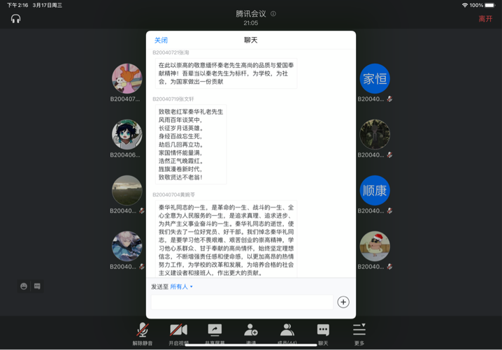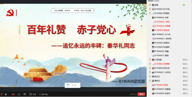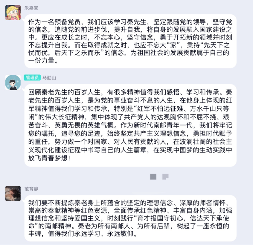 公司2020级各团支部也于3月17日开展秦老事迹线上讨论会,旨在缅怀秦老,勉励南邮青年继往开来。讨论会介绍了与秦老相关的南邮发展历程以及秦华礼老先生的红色事迹,让同学们深入了解了秦老为南邮做出的巨大贡献,并深刻领会了秦老的精神。在“我想对秦老说”环节中,大家积极讨论,踊跃发言,道出自己的心声,以文字的形式表达内心深处对秦老的钦慕和怀念,表明自己要不断拼搏进取、开创未来的坚定信念。