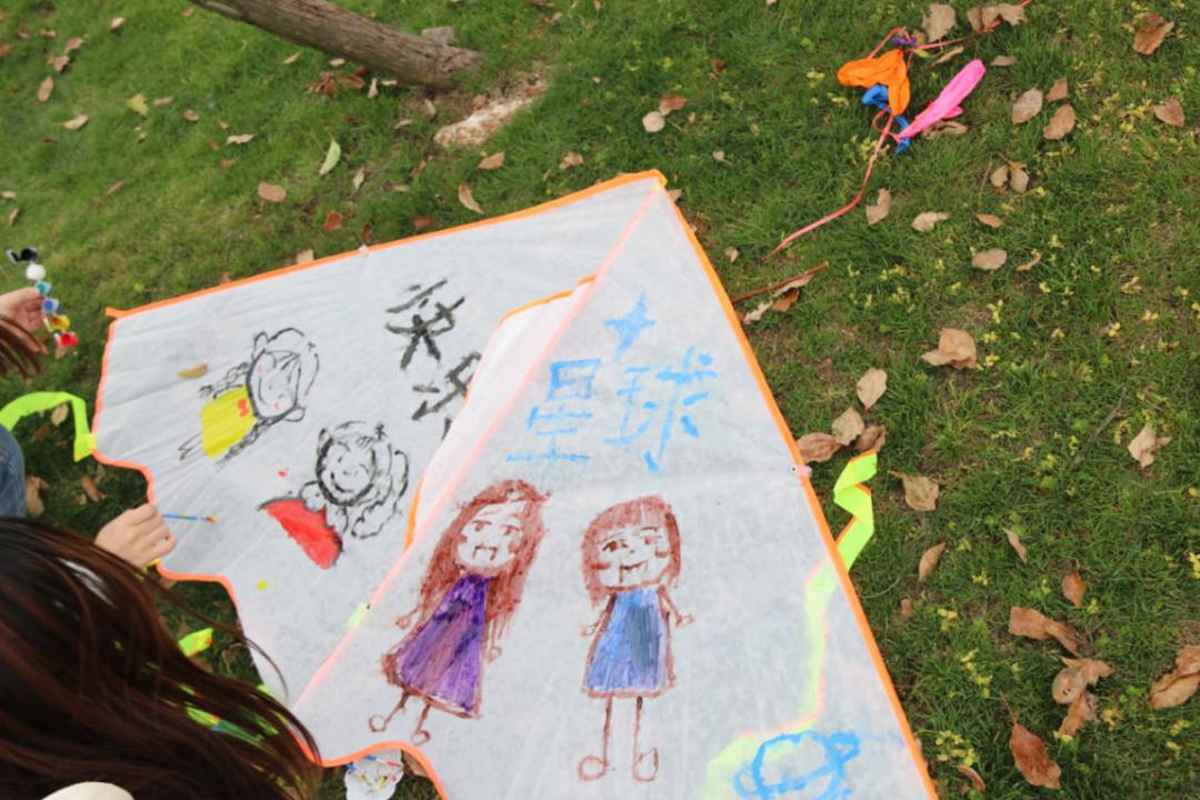 游戏过后,心协和员工会共同组织全体同学进行风筝DIY制作以和放飞,大家分组合作,在空白的风筝上描绘自己的所感所想,或纪念缤纷的老员工活,或展望无限可能未来,或赞颂我党的百年峥嵘……一只只被同学们精心装饰过的风筝,伴随着和煦暖风,缓缓升空,在蓝天留下了多彩的印记。