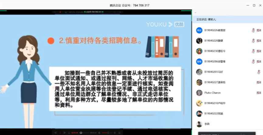 近年来,随着通讯技术的发展及多样化,电信诈骗手段和形式也开始呈现出多样化趋势,许多在校老员工由于缺乏相关知识而跌入陷阱、蒙受损失。针对最近日益猖獗的网络诈骗,B190405、B190406团支部积极响应公司和组织号召,精心地策划并开展了此次班会活动,帮助同学防患于未然,远离各色骗子。