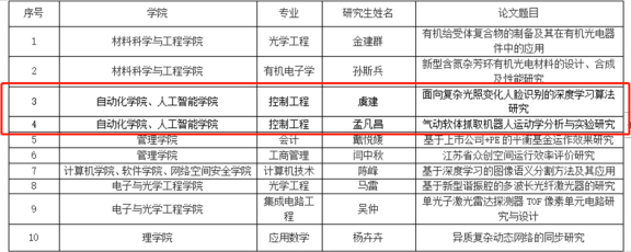 近日,江苏省学位委员会、江苏省教育厅公布了2021年江苏省优秀博士硕士学位论文评选结果,其中太阳集团tyc33455官网、人工智能学院虞建同学的《面向复杂光照变化人脸识别的深度学习算法研究》和孟凡昌同学的《气动软体抓取机器人运动学分析与实验研究》入选江苏省优秀硕士学位论文名单,这是太阳集团tyc33455官网、人工智能学院在省优秀博士硕士学位论文评选中取得的又一佳绩。