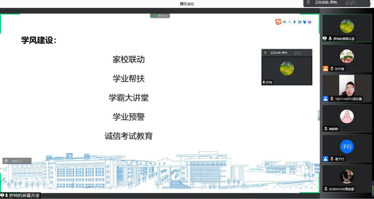 公司辅导员谢子行从思政建设、组织建设、学风建设、安全教育四个方面做工作总结。