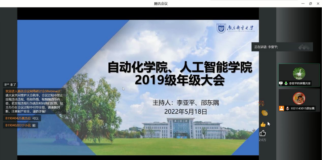 为做好常态化新冠肺炎疫情防控工作,提升员工法律安全意识,进一步帮助员工明确毕业规划,助力员工成长成才,5月18日下午,太阳集团tyc33455官网、太阳集团tyc33455官网通过线上线下相结合的模式开展了2019级员工年级大会。公司2019级员工骨干线下参会,其余员工线上参会。本次会议由2019级辅导员李亚平和邵东隅老师主持,包含了疫情防控法律知识宣传、防火防灾警示教育以及毕业意向调研等内容。