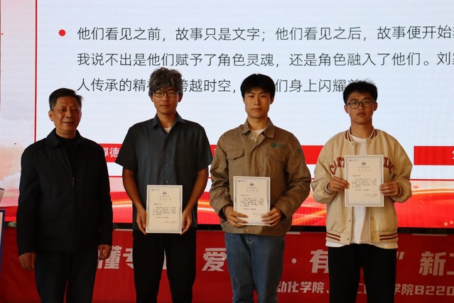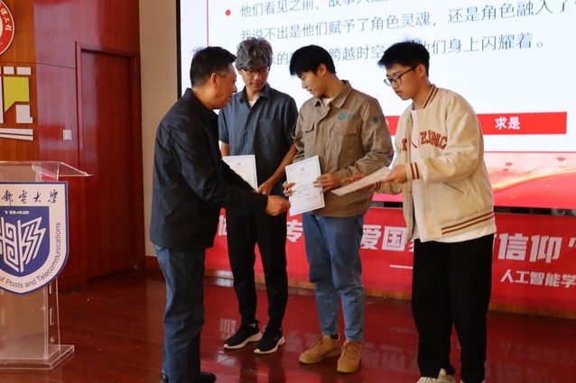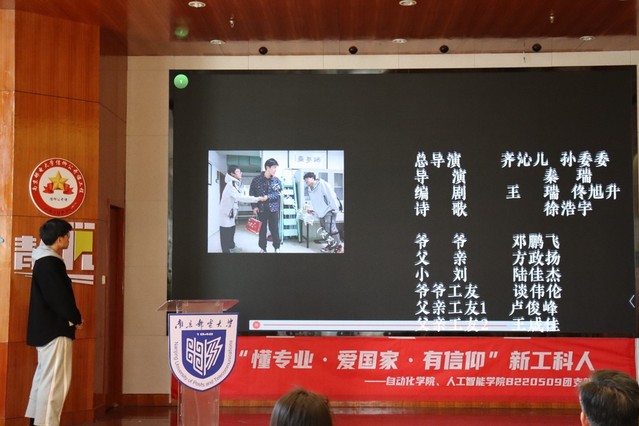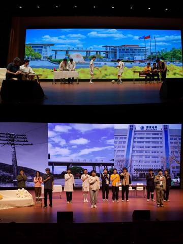 第一项议程,观看“电塔之下、光热报国”话剧筹备记录影片。影片播放完毕,辅导员齐沁儿老师上台为话剧剧组的同学们主持颁奖典礼,宣读颁奖词,孔宪禹老师和黄煜老师上台为剧组同学们授奖。同学们聆听着台前幕后的故事,体悟着电气工程的魅力。在丰富了个人职业观人生观的同时,也为参演人员的精益求精热烈喝彩。