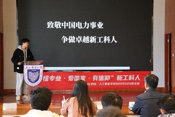 下一项议程,主持人邀请班主任黄煜老师上台,为同学们就电气专业做职业规划讲解。黄煜老师结合自身经历,就专业学习内容、电网未来方向、就业前景等方面深入浅出地分享了个人观点,同学们静坐聆听,又一次深入了解了电气工程以及职业内涵。