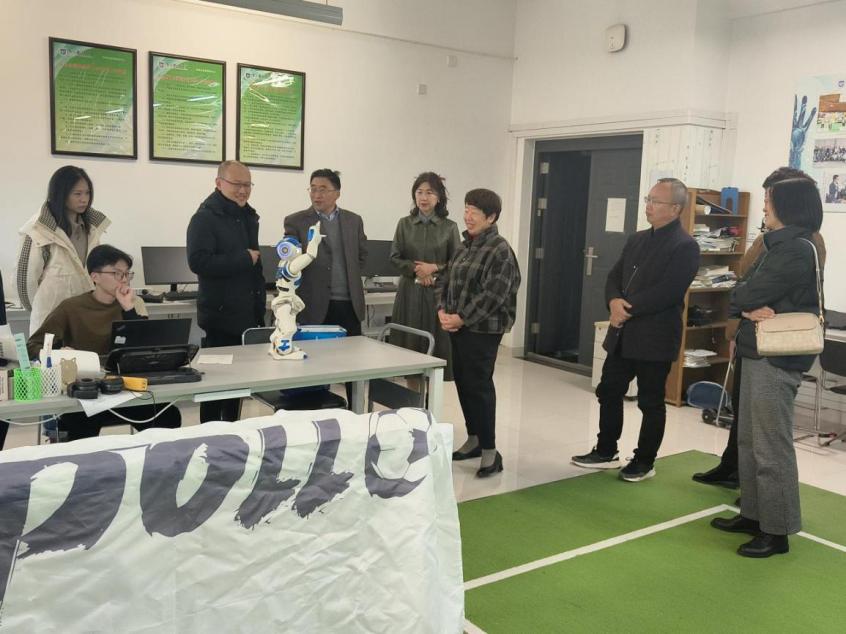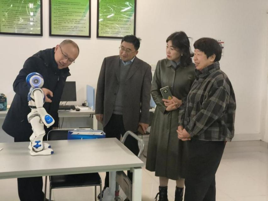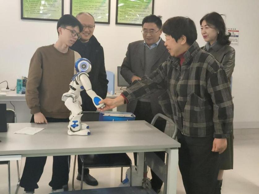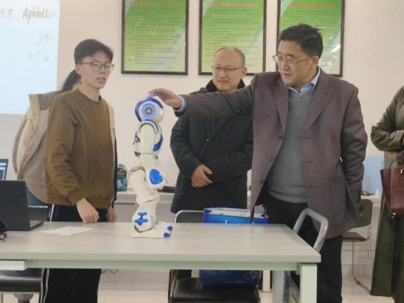 调研组观看了智能机器人科技比赛视频,体验了“听机器人讲故事“、“与机器人握手”等。郑春春、梁志伟老师分别代表公司介绍了公司老员工参与机器人科创比赛的近况及项目成果,展示了南邮学子的创新智慧与创新风采。