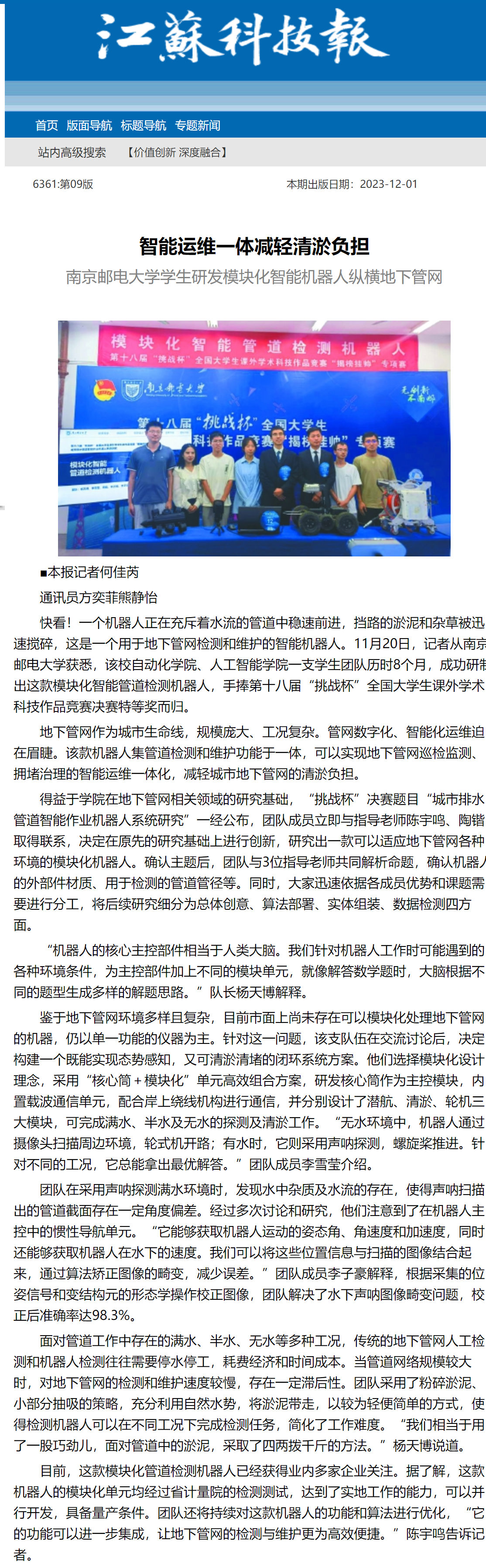【江苏科技报】智能运维一体减轻清淤负担太阳集团tyc33455官网员工研发模块化智能机器人纵横地下管网
