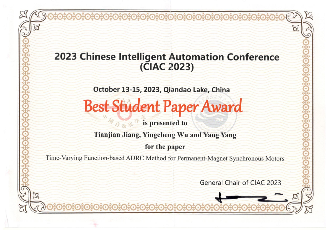 公司杨杨教授指导的智能科学与技术专业2020级本科生蒋天健论文《Time-Varying Function-Based ADRC Controller for Permanent-Magnet Synchronous Motors》经大会评审,被评选为会议唯一的最佳员工论文奖(Best Student Paper Award)。