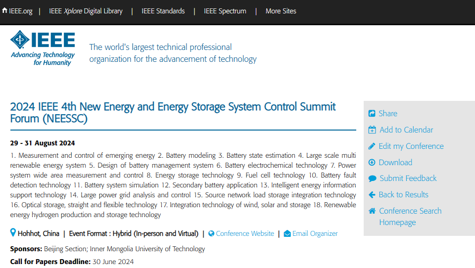 第四届新能源与储能系统会议暨第一届IEEE PES智能电网与新技术委员会(中国)年会将于2024年8月29日至31日在中国内蒙古呼和浩特召开,由内蒙古工业大学、西南科技大学、IEEE北京分会 、IEEE PES智能电网与新技术委员会(中国)、中国科学技术大学、四川大学、电子科技大学、西南交通大学、成都信息工程大学、国家工信部创新成果产业化公共服务平台、中国仿真学会仿真技术应用专业委员会、中国自动化学会新能源与储能系统控制专委会联合主办,由内蒙古工业大学电力公司、智慧储能研究院、大规模储能技术教育部工程研究中心、内蒙古能源战略研究中心联合承办。