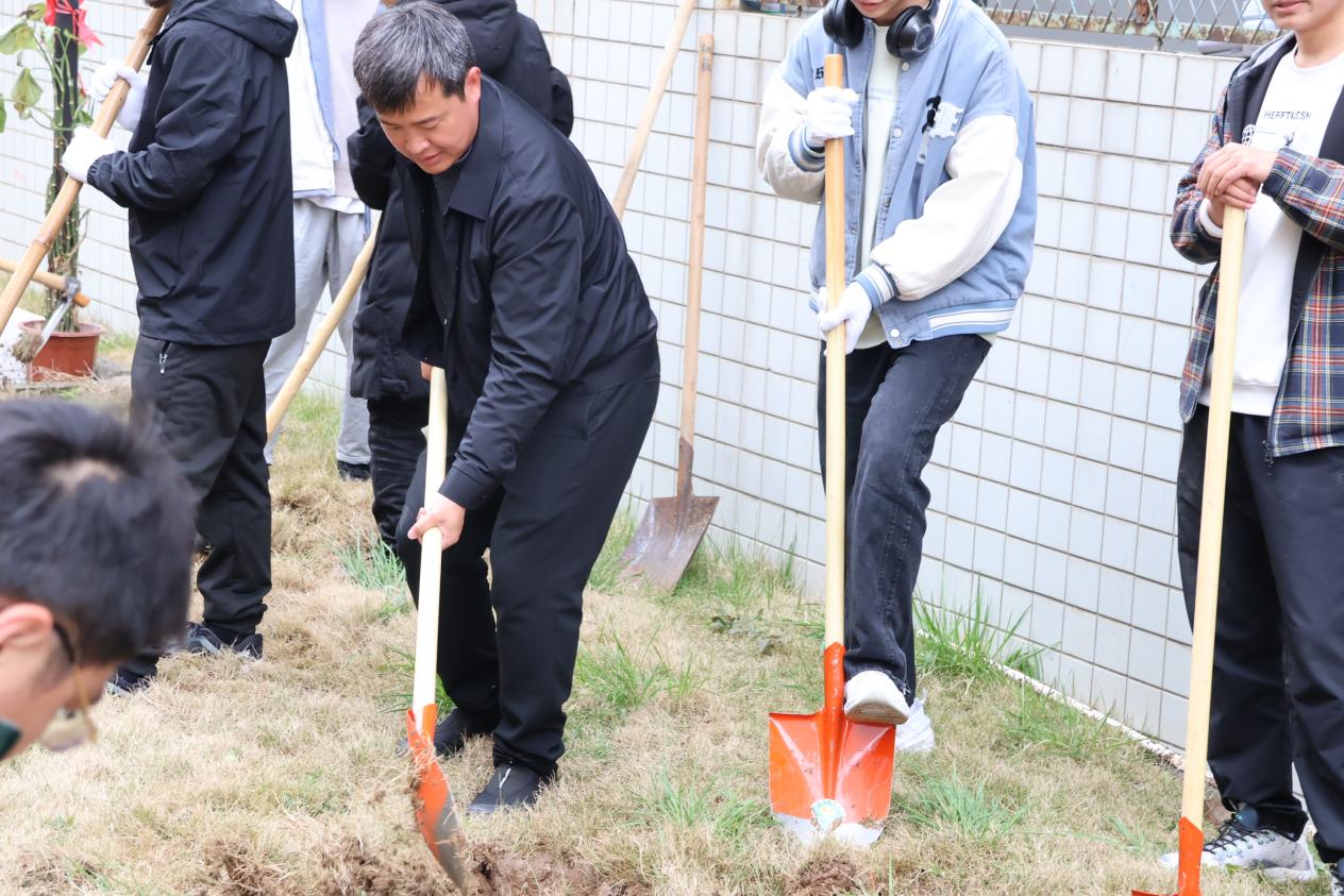 翻土、松土、铲草等知识在课堂中只是偶有了解,但真正的学习要经过同学们的实践后才会有深刻的认识。每一次举起锄头,再用力砸下,向自己的方向反复推拉,将土翻松,这个过程要一遍遍重复。翻土期间,不少同学感慨道:“原来真正的劳作是如此不易!”在劳作的间隙,领导老师们也与宿管阿姨进行交谈,了解栽植树木的品种以及栽培的周期等情况,并和同学们一起分享交流劳动的感受。
