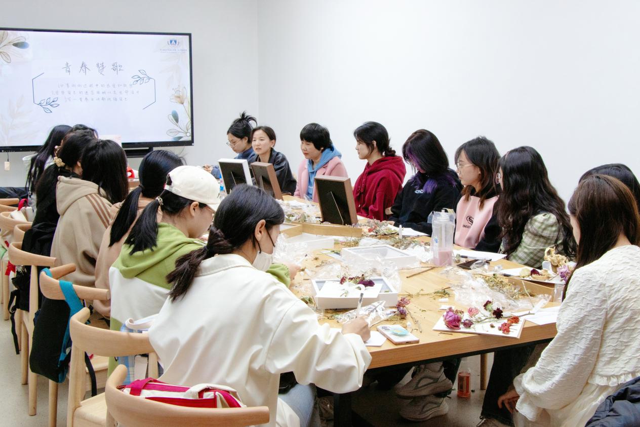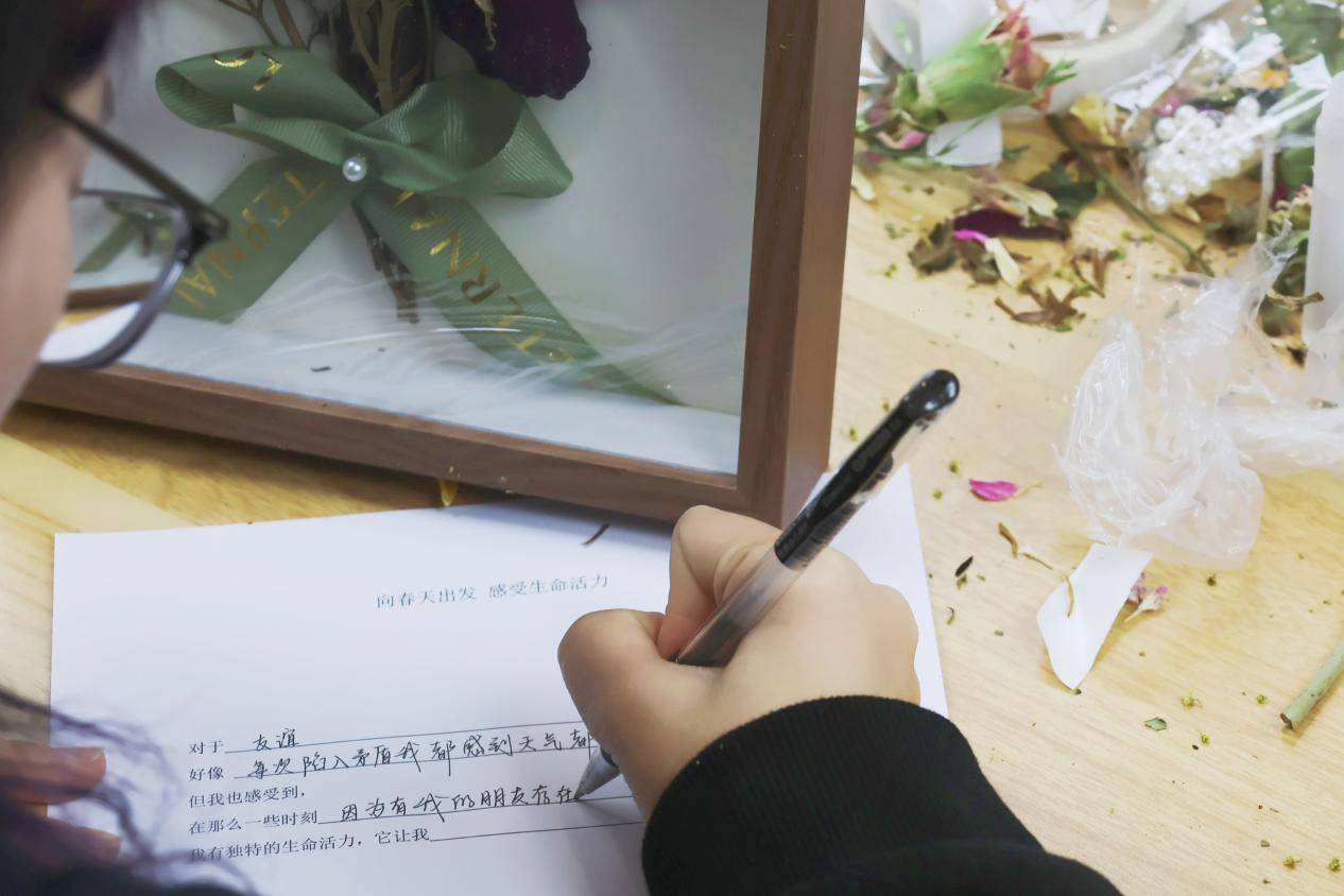 在“五位一体”的心理健康教育格局的构建中,“实践活动”和公司产品、咨询服务、预防干预、平台保障,处于同样重要的地位。为了增强人文关怀和心理疏导的专业性,辅导员齐老师邀请到校心理中心介若楠老师,于沙龙活动中嵌入了一场“心理微团辅”,通过回顾手工制作过程的感受、觉察有生命力的时刻、写下赠与自己的青春诗歌等小环节,将育心和育德相结合,着力培育员工理性平和、积极向上的健康心态。
