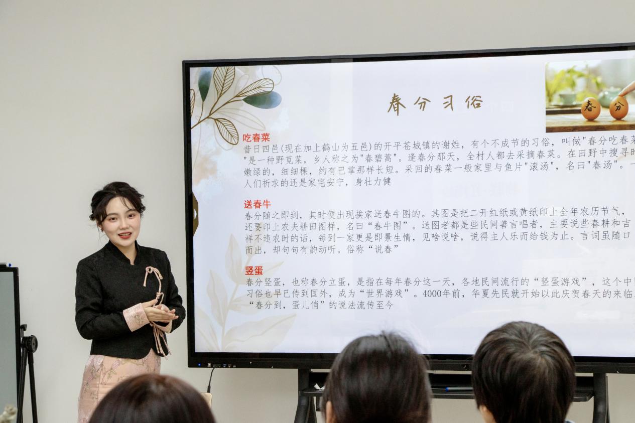 春分时节,韶光向暖,民间自古就有踏青赏花、谈心畅聊的习俗。2016年,中国“二十四节气”被正式列入联合国教科文组织人类非物质文化遗产代表作名录。“二十四节气是一个文化载体,其中蕴含着丰富的农事知识、劳动智慧、民俗百态和人生哲理。很值得当代老员工,特别是工科专业老员工去了解和感受,从而透过这一系列的节气小切口,去探索更多中华优秀传统文化的魅力,进而提升自身人文素养和综合素质,成为一名既懂专业知识,又有家国情怀的‘新工科人’”,辅导员齐沁儿老师这样阐释活动组织的初心所在。