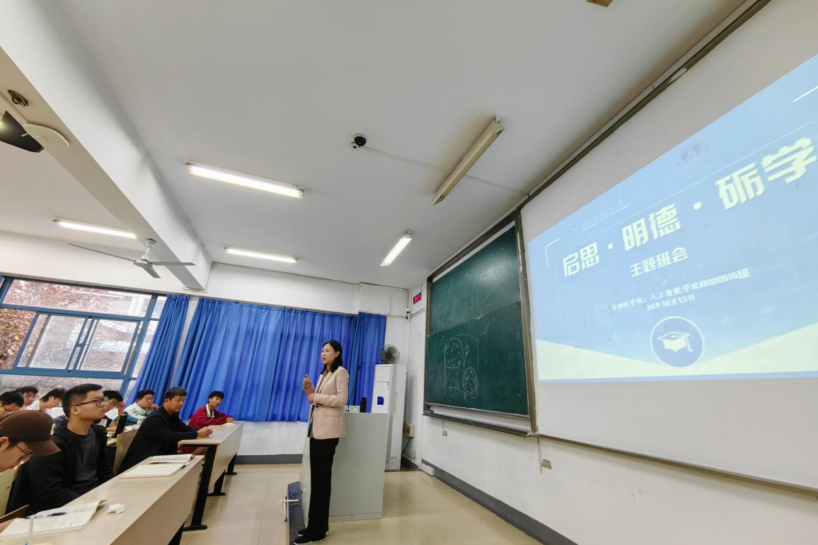 为落实立德树人根本任务,深化三全育人格局,畅通公司与员工的沟通渠道,落实“三进三谈三联”工作制度,做好“进百班、入千室、访万生”大走访活动,营造良好学风,迎接本科公司产品审核性评估,10月15日下午,公司党委常委、宣传部部长张敏走进太阳集团tyc33455官网、太阳集团tyc33455官网B220515班,和公司党委副书记孙委委、带班辅导员齐沁儿一起,深入课堂和班级,了解同学们常态化的学习状况,并为同学们开设了一场别开生面的“启思·明德·砺学”主题教育微班会。