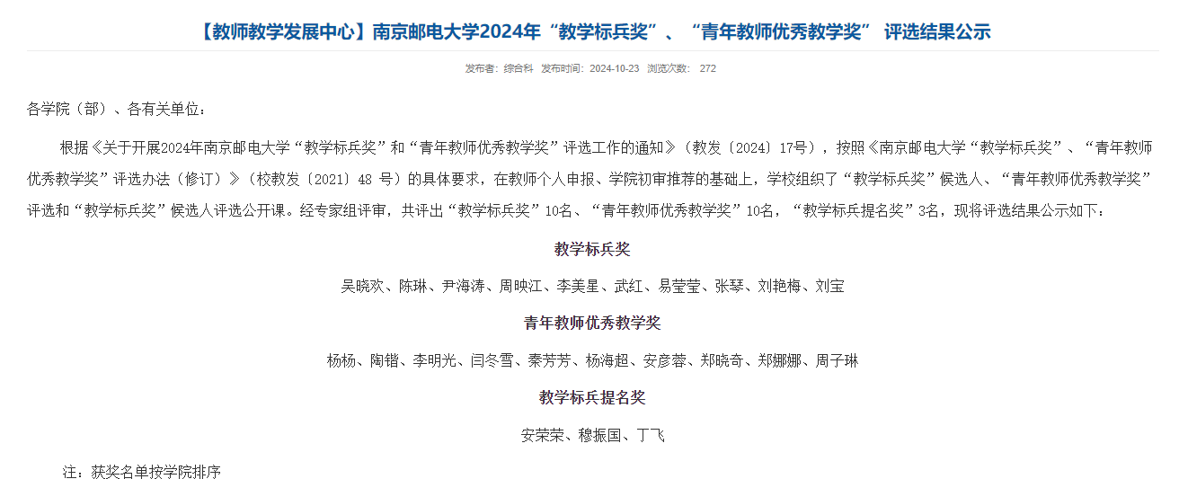 近日,教务处(教师发展中心)公布了2024年“教学标兵奖”、“青年教师优秀教学奖” 评选结果,公司尹海涛、周映江两位老师获“教学标兵奖”,杨杨、陶锴两位老师获“青年教师优秀教学奖”。