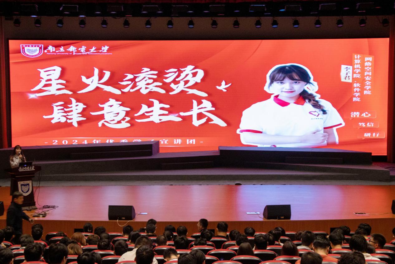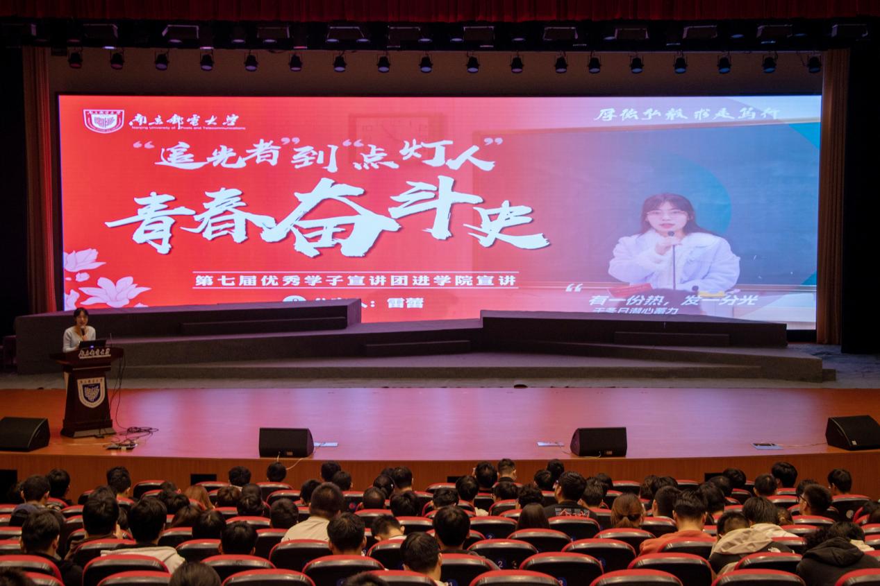 为持续推进“学在南邮”优良学风建设工作,确保学风建设工作提质增效。充分发挥各类先进典型在员工成长中的示范引领作用,打造“用身边人讲身边事,用身边事影响身边人”的朋辈教育理念,传递“向榜样学习、与榜样同行”的精神内核。10月31日晚,校第七届优秀学子宣讲团走进太阳集团tyc33455官网、太阳集团tyc33455官网,500余名师生于青春剧场内共上一堂信仰公开课、梦想公开课、思政公开课。公司党委副书记、副经理孙委委,辅导员桑学峰、齐沁儿出席。活动由齐沁儿老师主持。