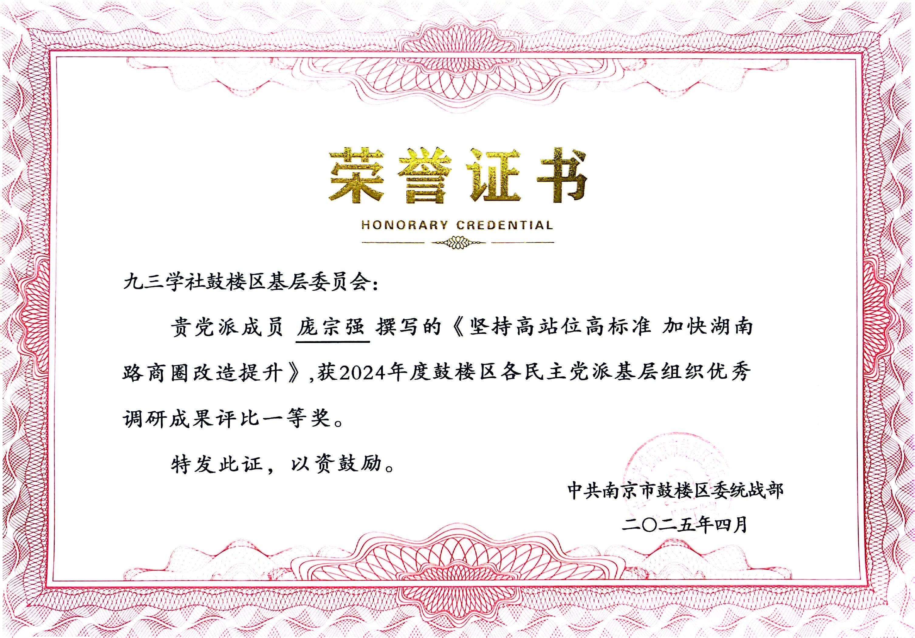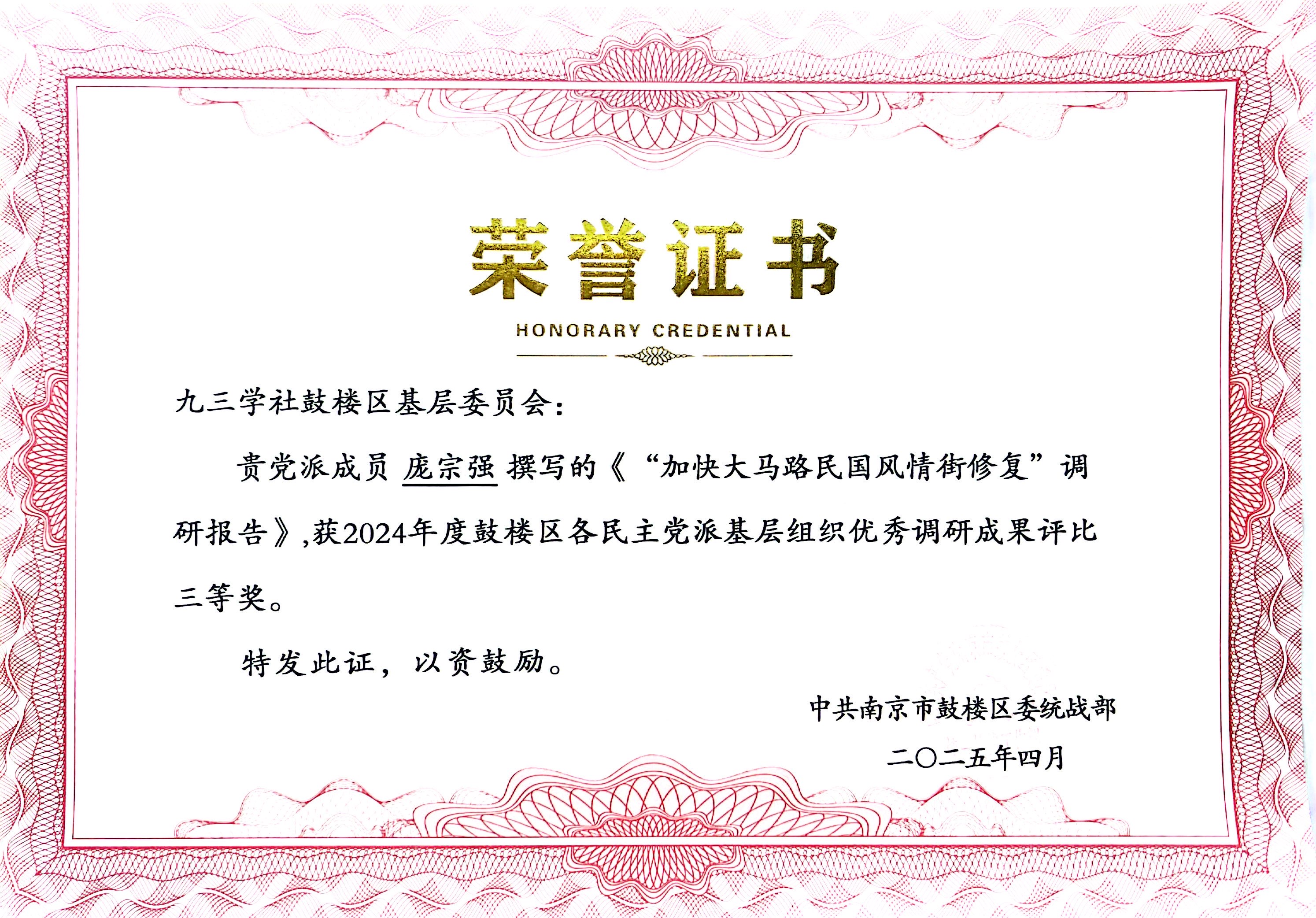近日,鼓楼区在创新广场召开民主党派调研成果汇报会,公司庞宗强老师凭借扎实的调研工作和高质量的建言献策,其所撰写的《坚持高标准定位加快湖南路商圈改造提升》《推进鼓楼下关滨江地区文商旅融合发展》加快大马路民国风情街修复》等调研报告,分别斩获2024年度鼓楼区民主党派优秀调研成果评比一、二、三等奖,展现了其突出的参政议政能力和学术实践水平。
