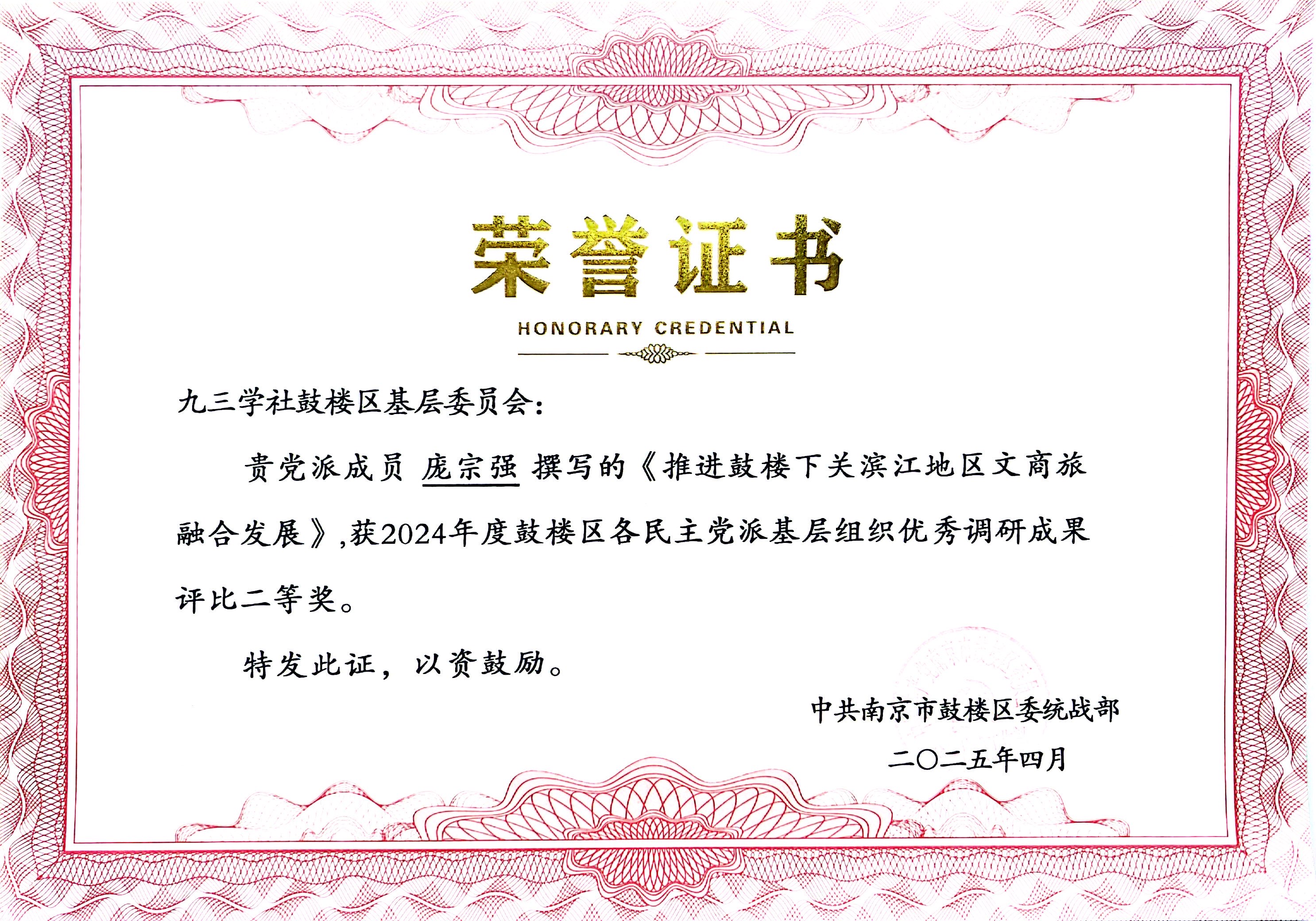 公司庞宗强老师三项调研成果获鼓楼区民主党派优秀调研成果奖
